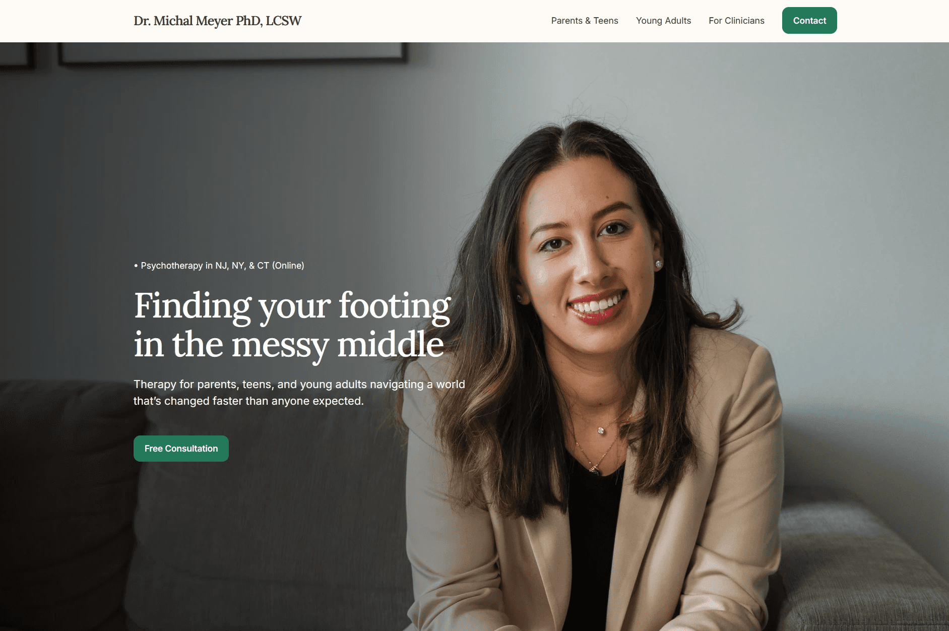 Michal Meyer is a therapist and educator whose expertise runs significantly deeper than her online presence ever communicated. She had built a strong clinical reputation and was actively teaching, supervising, and developing educational content, but the digital platform connecting all of that did not exist in any coherent form. The gap between what she was doing in the room and what anyone could find about her online meant that her authority was essentially invisible to anyone outside her immediate professional circle.