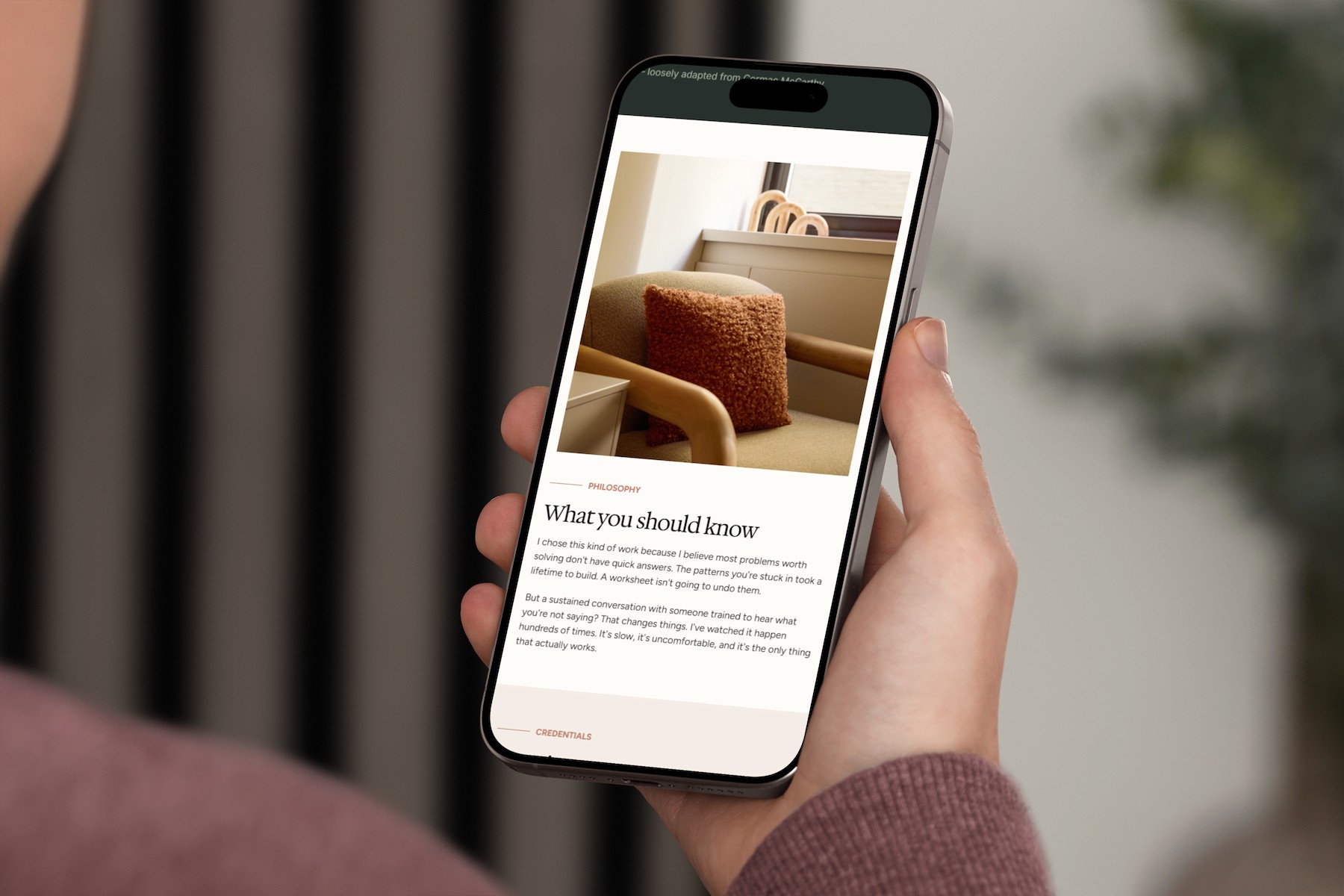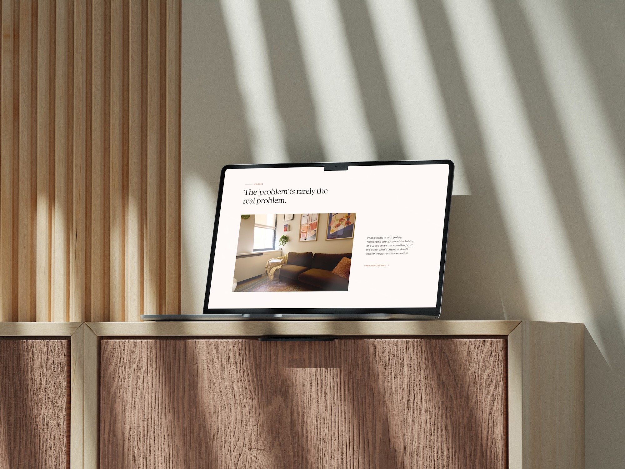 We rebuilt everything from the ground up. Through a series of deep brand discovery sessions, we extracted the philosophical core of her work: a blend of warmth and directness she calls "brutally practical optimism," a belief that symptoms are signals rather than the real problem, and a therapeutic stance built on the idea that the patterns shaping your life took years to form and a worksheet is not going to undo them. That became the foundation for a new personal brand, full site architecture, custom copy, and a visual identity rooted in the warmth and intentionality of her own office space.